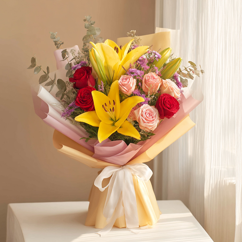 This bouquet is a spilled palette blooming into romance under soft light. Yellow lilies shine like tiny suns, hiding warmth in their petals; pink roses blush with gentle sweetness; red roses flicker like dancing flames, burning with passion; tiny purple blooms add a touch of dreaminess. Wrapped in pink and yellow paper and tied with a white ribbon, it gathers the colors and sweetness of all seasons into this fragrant bundle. Each flower seems to say: "Here’s an entire radiant universe, just for you"—a vivid and tender embodiment of beauty.